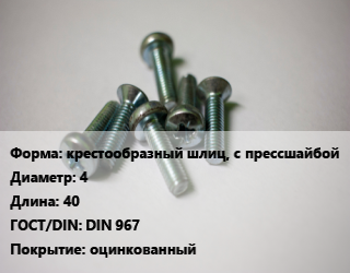 Винт крестообразный шлиц, с прессшайбой 4х40 DIN 967 оцинкованный