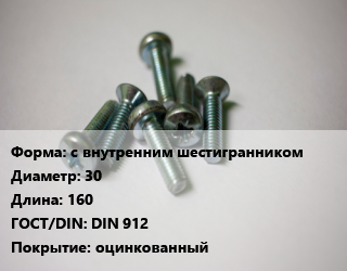 Винт с внутренним шестигранником 30х160 DIN 912 оцинкованный, 10.9,12.9,8.8, цена за шт, кг цена от 386.71 ₽ / кг, где купить, условия доставки в Оренбурге и Оренбургской области